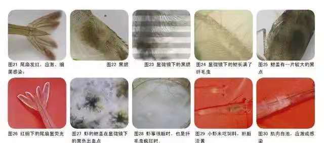 看鳃知底水: 虾是通过鳃过滤水中的氧 国色天香果冻传媒国卡1区,底水的好坏直接在鳃上体现出来:黄鳃,黑鳃(图22,图23),然而,有一问题却被疏忽了——纤毛虫(图24),水质发浓,虾靠边,且有个别死亡,十有八九是虫在作怪,在实践中,另有三个特征:①鳃盖上有成片的较大黑斑(图25),②红碗中尾扇边缘有荧光(图26):因长虫后细菌感染而成,③虾筝很脏(图27,图28),像是地图,处理很简单,根据天气,底层水溶解氧,确定药物提高透明度,要记住,底好,水好,虫少,胃口好。